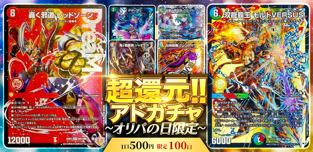 どういうことか?こちらのオリパは1口500円で、当たりには《轟く邪道 レッドゾーン》、《双龍覇王 モルトVERSUS》といった高額カードや500円以上の当たりカードが入っていることはもちろん。