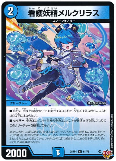 自己軽減がとにかく便利で、《看護妖精メルクリラス》の軽減と合わせて2コストで出すことも結構ある。「進化元になった時」「進化クリーチャーを召喚した時」を軽率に満たしていこう。