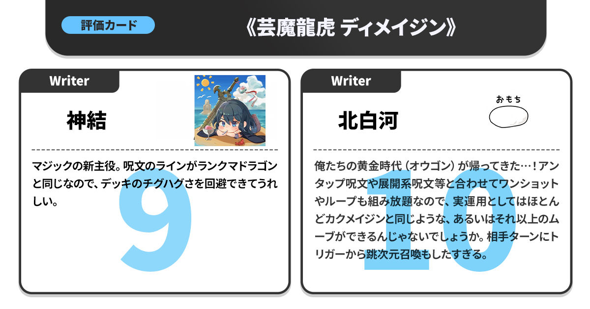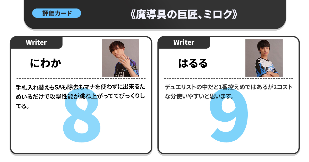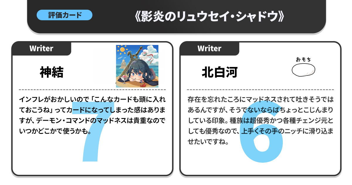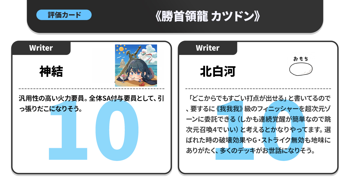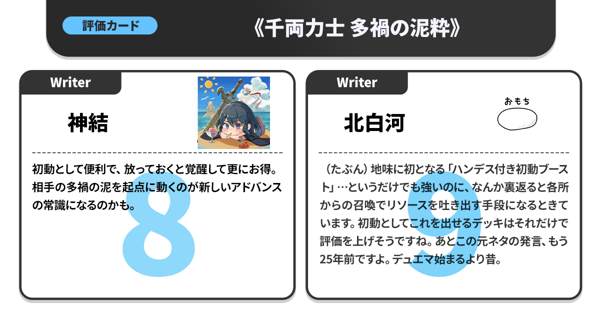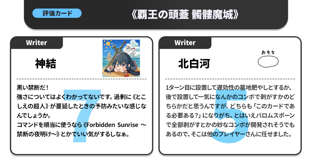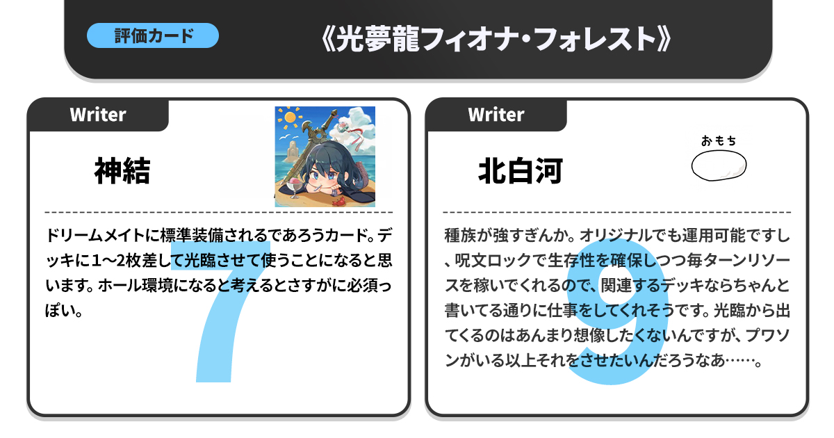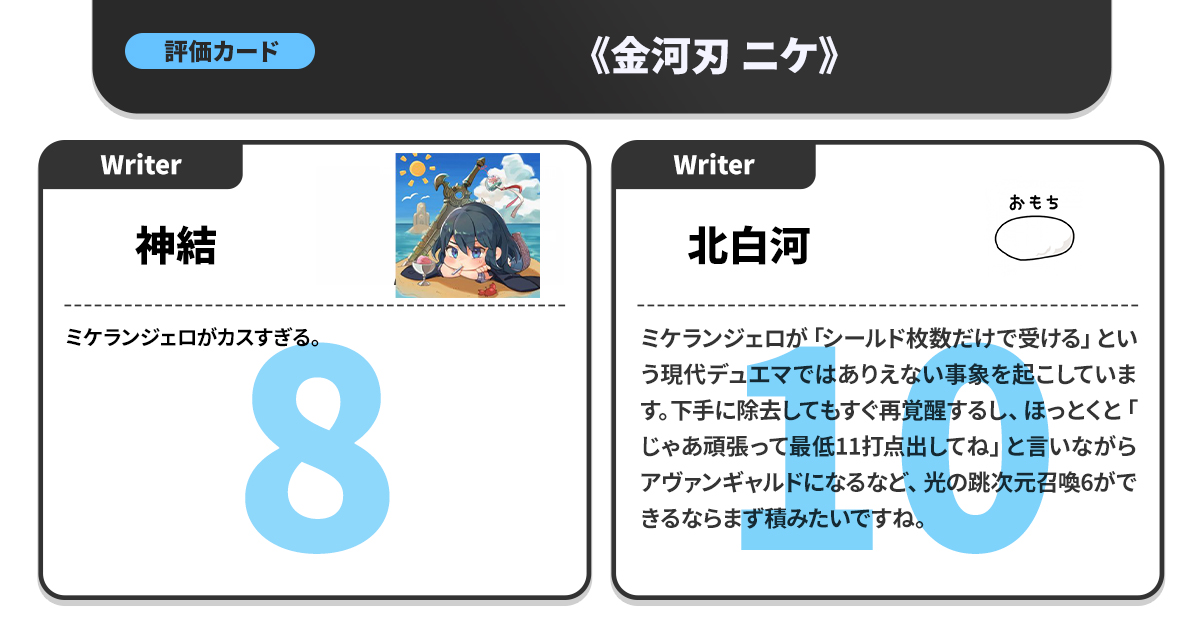 カジュアル目線でのポイント付けという貴重な視点を持つため、「競技勢と同じ高得点がついたカードはマジですごい」という指標にもなっている。