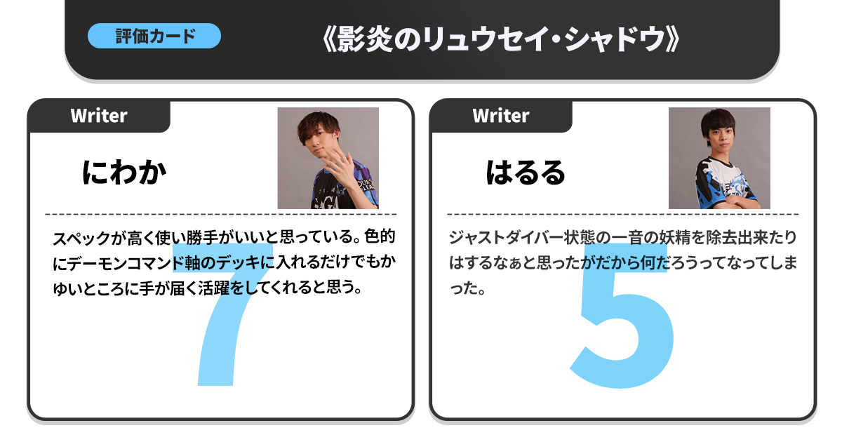 卓越した文章力と類稀なるユーモアのセンス、そして独自の切り口が光る、デュエマ生え抜きでは最高峰のライター。多種多様な媒体でデュエマ関連のライティングを手掛け、「デュエマのライターと言えば?」の問いに真っ先に名前が挙がることもしばしば。
