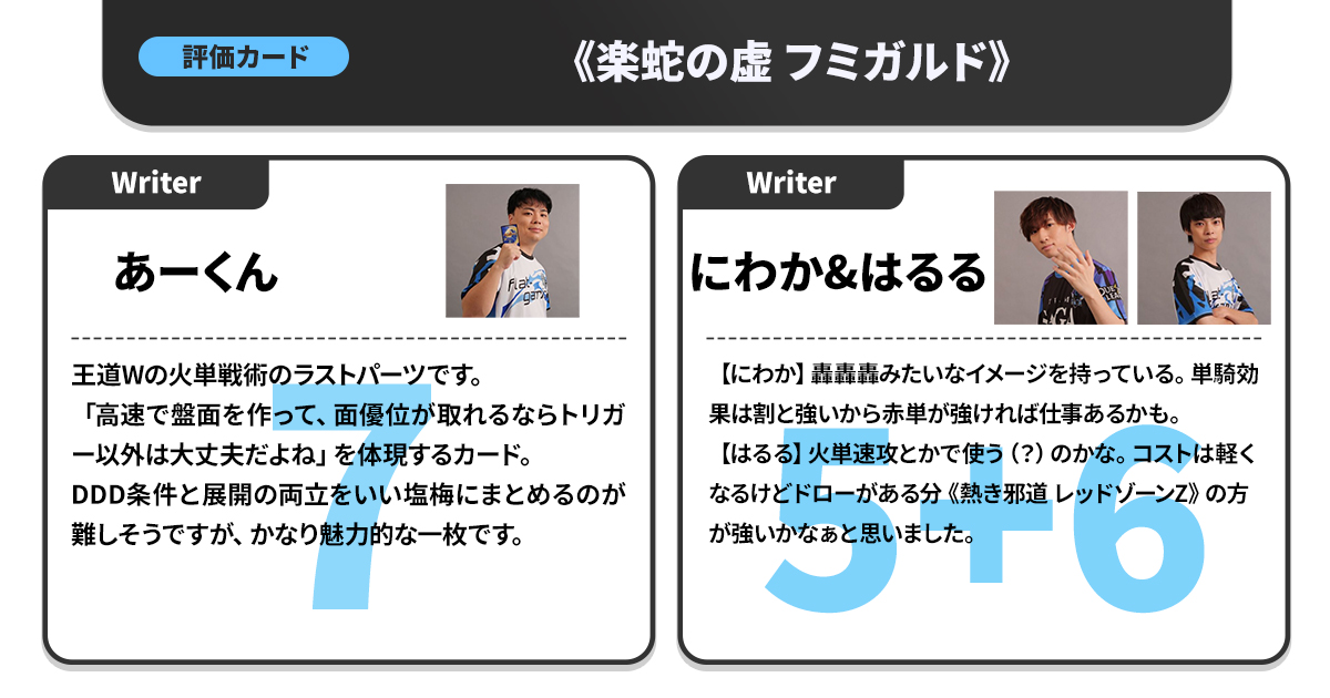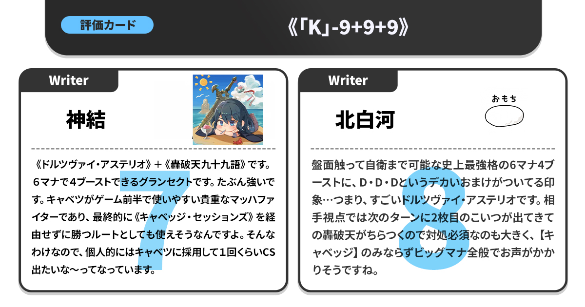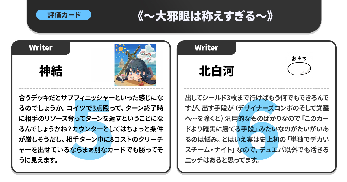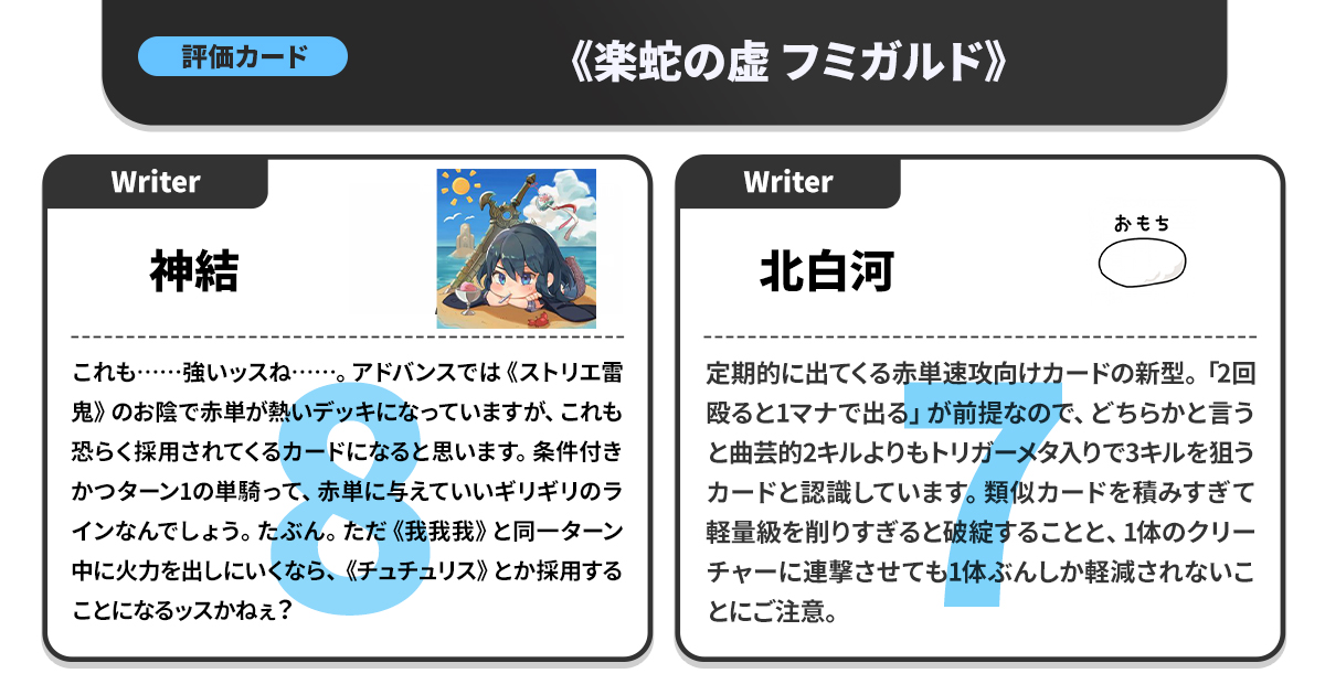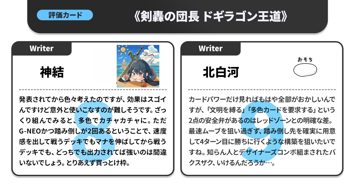 卓越した文章力と類稀なるユーモアのセンス、そして独自の切り口が光る、デュエマ生え抜きでは最高峰のライター。多種多様な媒体でデュエマ関連のライティングを手掛け、「デュエマのライターと言えば?」の問いに真っ先に名前が挙がることもしばしば。
