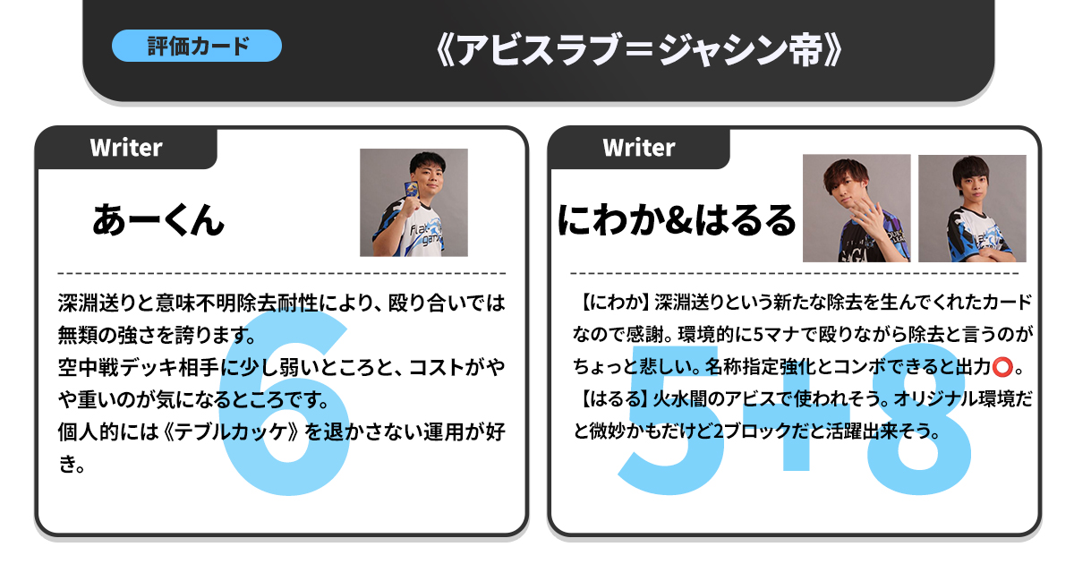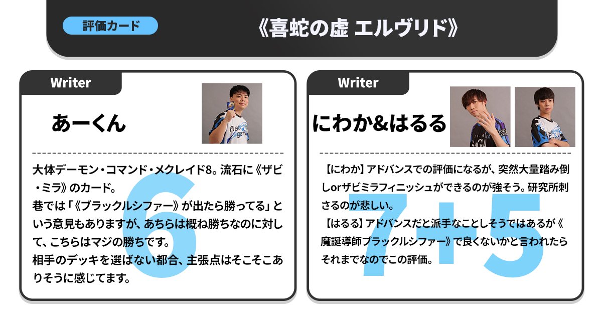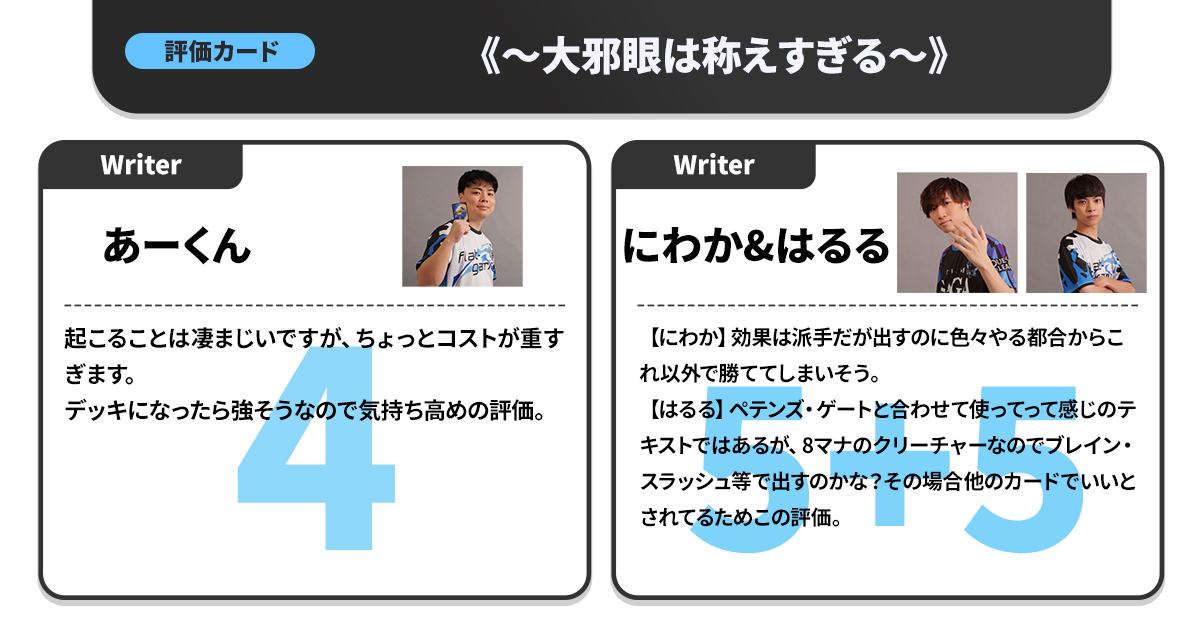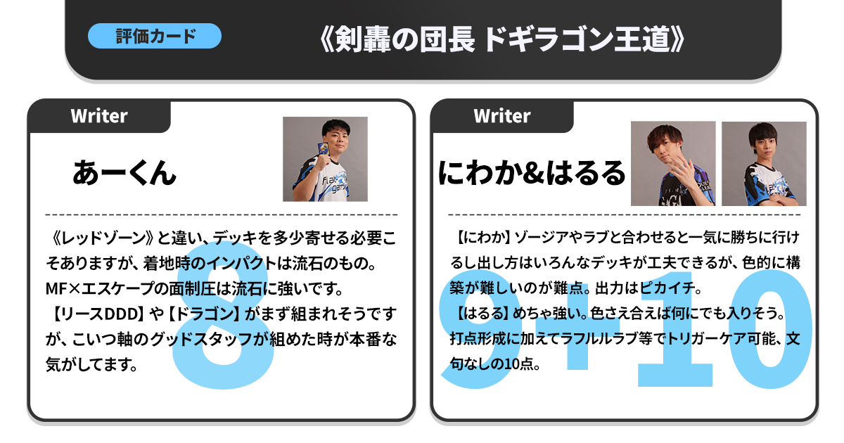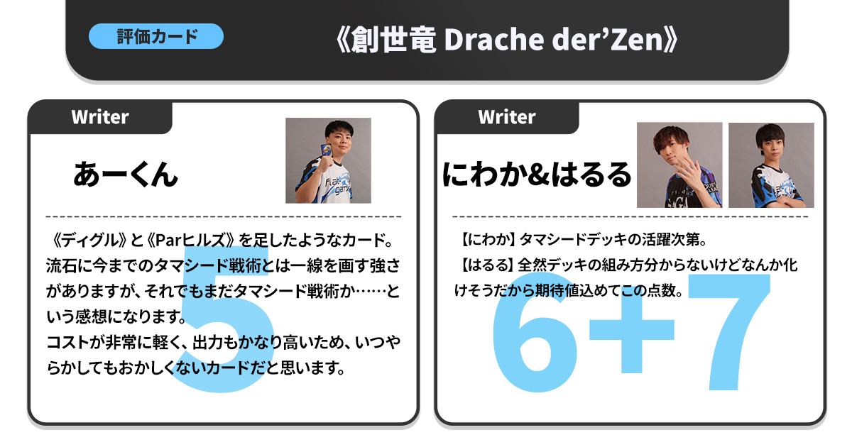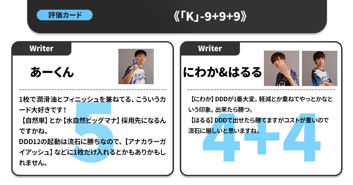 卓越した文章力と類稀なるユーモアのセンス、そして独自の切り口が光る、デュエマ生え抜きでは最高峰のライター。多種多様な媒体でデュエマ関連のライティングを手掛け、「デュエマのライターと言えば?」の問いに真っ先に名前が挙がることもしばしば。