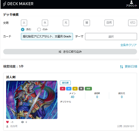 キーパーツ数枚程度を含むデッキを検索することで、このアイデアが既出か初出があるかが見込める……ということですね。この検索結果が「1件」ならば、晴れて私は未踏の地に到達したことになります。