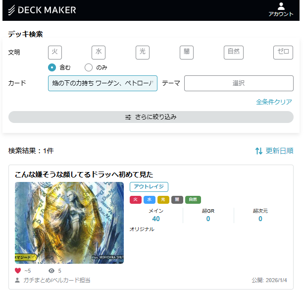 キーパーツ数枚程度を含むデッキを検索することで、このアイデアが既出か初出があるかが見込める……ということですね。この検索結果が「1件」ならば、晴れて私は未踏の地に到達したことになります。