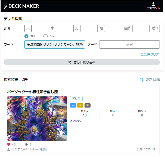 キーパーツ数枚程度を含むデッキを検索することで、このアイデアが既出か初出があるかが見込める……ということですね。この検索結果が「1件」ならば、晴れて私は未踏の地に到達したことになります。