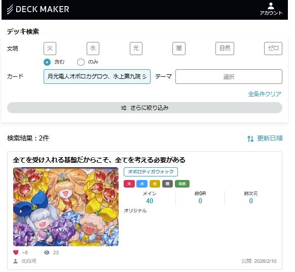 キーパーツ数枚程度を含むデッキを検索することで、このアイデアが既出か初出があるかが見込める……ということですね。この検索結果が「1件」ならば、晴れて私は未踏の地に到達したことになります。