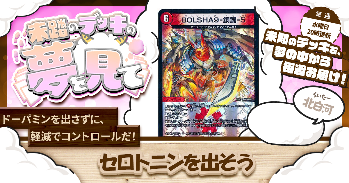 BOLSHA9-銅鑼-5を踏み倒しではなく、「たまに踏み倒しができるドローソース」くらいに考えて、コントロールっぽい動きに活かしてみるのはいかがでしょう。つまり、穏やかな幸せを司るセロトニンをいっぱい出すデッキを作るのです。