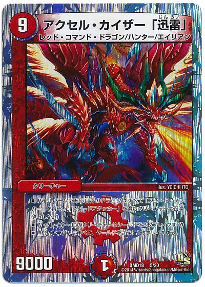 ・《ボルメテウス・サファイア・ドラゴン》2枚以上+《アクセル・カイザー 「迅雷」》1枚以上→サファイア2体でシールドを焼き切り、残りのドラゴンが全員ダイレクトアタック要員に