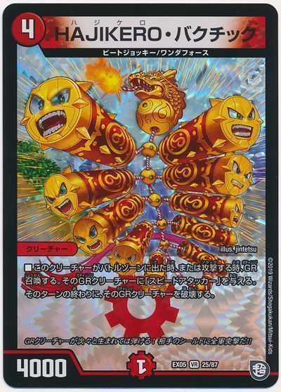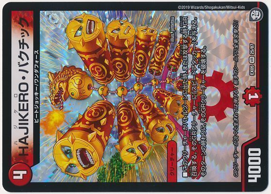 ■マナドライブ 2(火):このクリーチャーがバトルゾーンに出た時、自分のマナゾーンのカードが2枚以上で火文明があれば、相手のクリーチャーを1体選んでもよい。このクリーチャーとその選んだクリーチャーをバトルさせる。 (ゲーム開始時、GRクリーチャーは山札には含めず、自分の超GRに置き、バトルゾーン以外のゾーンに行った場合、超GRの一番下に戻す)