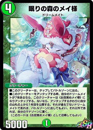 ちなみにもう1つの世界のデュエマでは《眠りの森のメイ様》が登場。「変身」のようなギミックを取り入れることで、《お目覚めメイ様》と併せたループ覚醒持ちのようなカードとして実装されました。