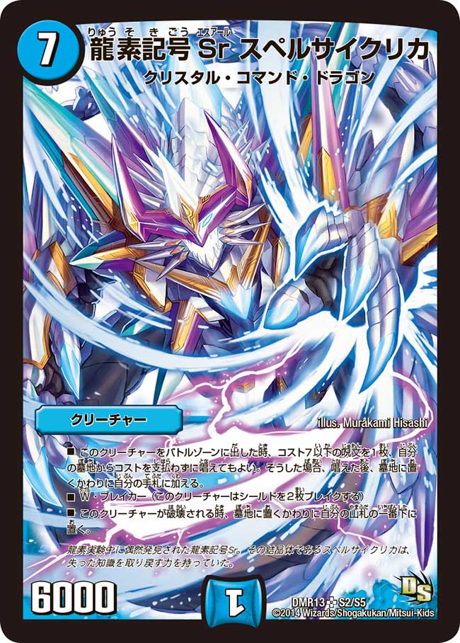 ■自分の火のドラゴンまたは火のヒューマノイドが攻撃する時、自分の山札の上から1枚目をすべてのプレイヤーに見せてもよい。それが進化ではないドラゴンまたは進化ではないヒューマノイドであれば、バトルゾーンに出す。それ以外なら、自分の山札の一番下に置く。
