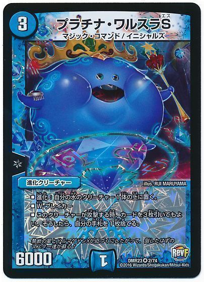 理想の動きとしては、2ターン目に青のクリーチャーからスタートし、3ターン目に《プラチナ・ワルスラS》に進化して2点。