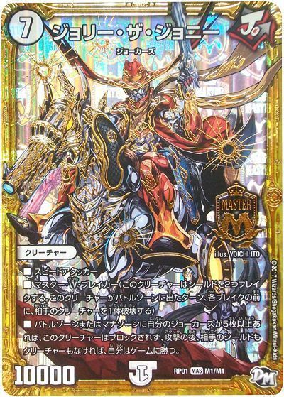 ■バトルゾーンまたはマナゾーンに自分のジョーカーズが5枚以上あれば、このクリーチャーはブロックされず、攻撃の後、相手のシールドもクリーチャーもなければ、自分はゲームに勝つ。