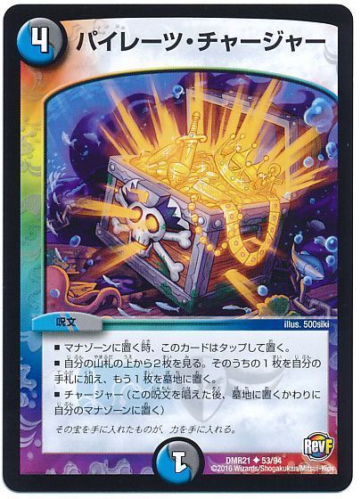 《龍素知新》が健在だったころは《ボーンおどり・チャージャー》型もチラホラ見たと記憶していますが、殿堂以降は3→5で繋ぐ旨味がないために2、3ターン目をルーター呪文で過ごし、4ターン目に《パイレーツ・チャージャー》を撃つという構築が増えていきました。