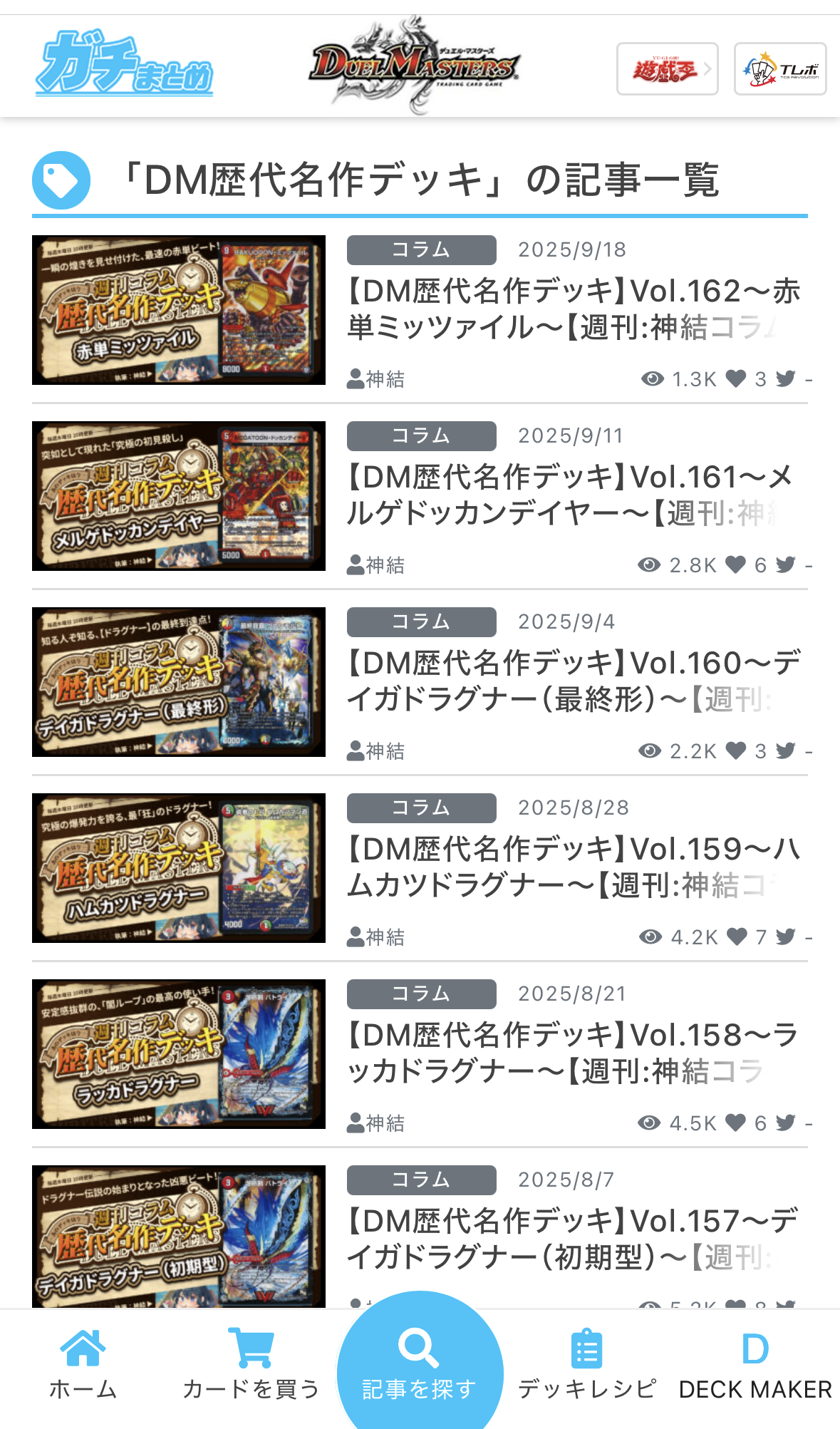 実は私のスマホだと、歴代名作デッキのバックナンバーがなんか上手く表示されないんですよね。ミッツァイルで止まっていますが、実はこのあとちゃんと2回分更新しています。