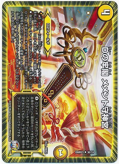 《Dの牢閣 メメント守神宮》の使い方の上手さ=このデッキの上手さになっていると思っています。特にスイッチのタイミング、貼り替えへのケア、それを意識した手札キープ、更に相手の楯から《Dの牢閣 メメント守神宮》がトリガーした時の対応として「先にスイッチして相手の盤面を寝かさせておく」などなど、多彩なテクニックがあります。