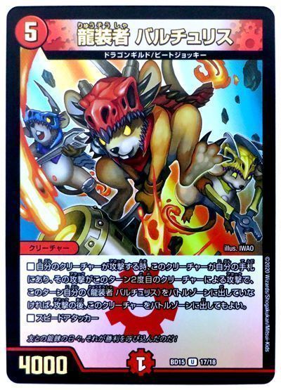 ■自分のクリーチャーが攻撃する時、このクリーチャーが自分の手札にあり、その攻撃がこのターン2度目のクリーチャーによる攻撃で、このターン自分の《龍装者 バルチュリス》をバトルゾーンに出していなければ、攻撃の後、このクリーチャーをバトルゾーンに出してもよい。■スピードアタッカー(このクリーチャーは召喚酔いしない)