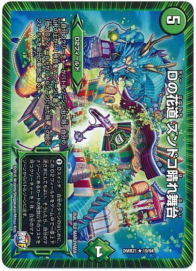 また《Dの花道 ズンドコ晴れ舞台》は中々に面白いカードで、ブーストブースト《Dの花道 ズンドコ晴れ舞台》から、ターン開始時にDスイッチすることで《龍装艦 ゴクガ・ロイザー》を投げ、着地ターンにそのままチェインコンボを決めてしまいます。これならクリーチャーとフィールドの分だけ避けられる除去が増えており、マッハファイターなどに対しては強く出られますね。
