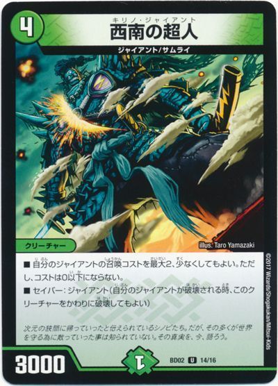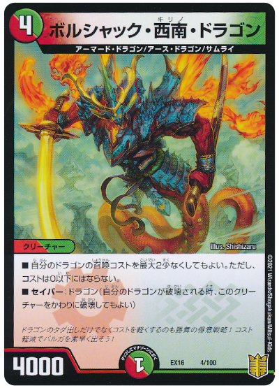 あの《 西南の超人 》が「ボルシャック」となって再登場した、軽減効果持ちドラゴンです。…その割には種族からジャイアントが消えているあたり、ジャイアントの歴史を破壊するディスペクター説がきたしーの中で浮上しています。