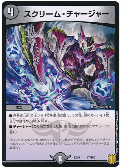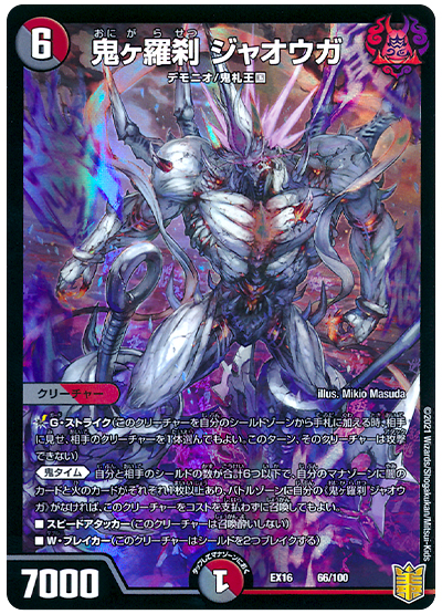 ■<鬼タイム>自分と相手のシールドの数が合計6つ以下で、自分のマナゾーンに闇のカードと火のカードがそれぞれ1枚以上あり、バトルゾーンに自分の《鬼ヶ羅刹 ジャオウガ》がなければ、このクリーチャーをコストを支払わずに召喚してもよい。
