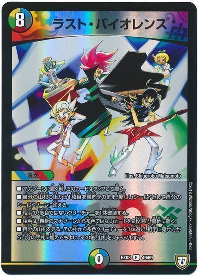 ■このクリーチャーが攻撃する時、またはこのクリーチャーの「EXライフ」シールドが自分のシールドゾーンを離れた時、コスト8以下の呪文を1枚、自分の手札からコストを支払わずに唱えてもよい。