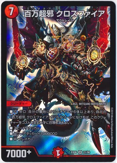 効果は死ぬほどシンプルで、色の合うデッキで鬼タイムに突入するとタダで出てくるSA2打点です。あとGストライク付き。自身の効果では盤面に一体までしか出せないので、《 百万超邪 クロスファイア 》みたいなもんですね。