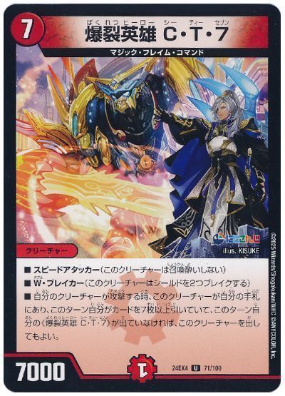 ■自分のクリーチャ―が攻撃する時、このクリーチャーが自分の手札にあり、このターン自分がカードを7枚以上引いていて、このターン自分の《爆裂英雄 C・T・7》が出ていなければ、このクリーチャーを出してもよい。