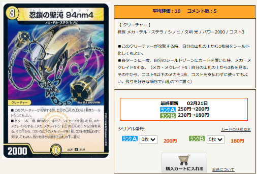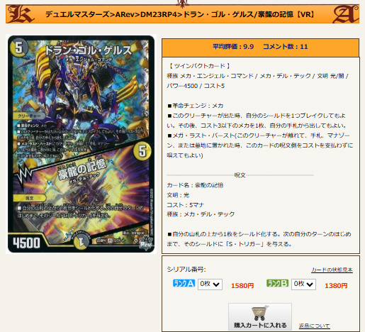 となると、踏み倒し先となる「ブロッカーを持ってて」「シールド追加戦略と相性がよく」「踏み倒しのリターンが十分あり」「予算的に100円を切るくらい安い」「光のメカ」というものすごく二ッチなカードが要求されるんですが、はたして……