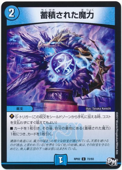 S・トリガー(この呪文をシールドゾーンから手札に加える時、コストを支払わずにすぐ唱えてもよい)カードを1枚引き、その後、自分の墓地にある《蓄積された魔力》1枚につき、カードを1枚引く。