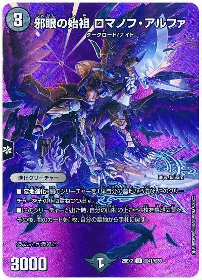 このデッキの《 邪眼の始祖 ロマノフ・アルファ 》、出せば出すほどリソースが増えるんで何しても出したいカードではあるんですよね。