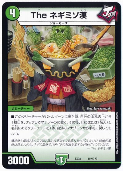《チャル名人》は《ドンジャングル》でマナから射出してもよし、《ネギミソ漢》の回収対象であることを活かして《ジョラゴン》から射出してもよしなカードになっています。