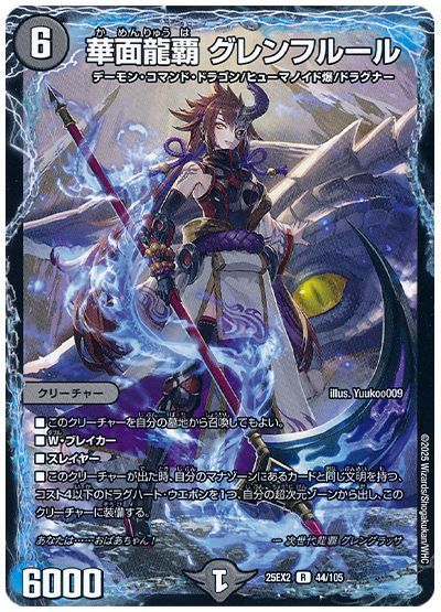 《華面龍覇 グレンフルール》。大人気の内に第一章の幕を閉じた『デュエル・マスターズGT -Gear of the Twin heart-』にてブイブイ言わせていたおばあちゃんです。今年のデュエマはメディアミックスが上手い。
