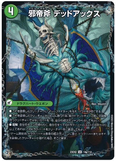バトルに勝ったタイミングで、倒した相手と同じ文明のドラグハートまで装備できるってんですからたまらない。追加のドラグハートの装備先は《邪帝斧 デッドアックス》を装備していたクリーチャー固定ですが、そんな不自由さも気にならなくなるほどのアドバンテージを稼いでくれます。
