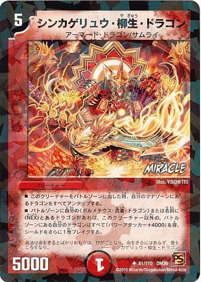 このカードなら仮に墓地に落ちてもフシギバースで再利用できますし、マナコストのせいでイマイチだった《シンカゲリュウ・柳生・ドラゴン》にも意味が生まれます。しかも何気に1マナブーストできるのも大きかったです。