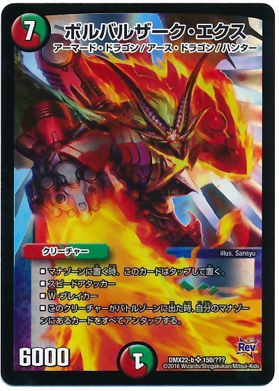 ■このクリーチャーをバトルゾーンに出した時、自分のマナゾーンにあるドラゴンをすべてアンタップする。■バトルゾーンに自分の《ボルメテウス・武者・ドラゴン》または名前に《NEX》とあるドラゴンがあれば、このクリーチャー以外の、バトルゾーンにある自分のドラゴンはすべて「パワーアタッカー+4000」を得、シールドをさらに1枚ブレイクする。