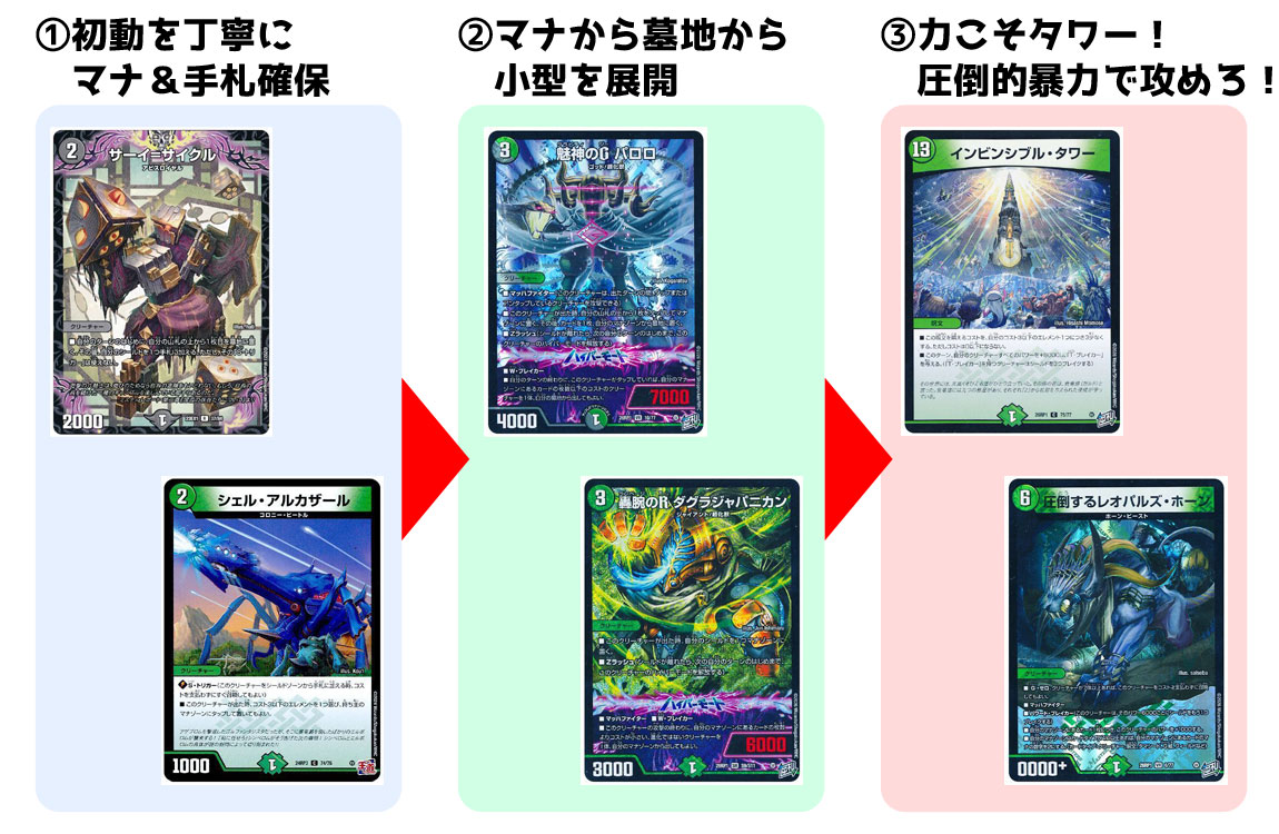 3体以上……できれば4~5体が並んだら《インビンシブル・タワー》!ムキムキクリーチャー軍団で一気に決着をつけよう!