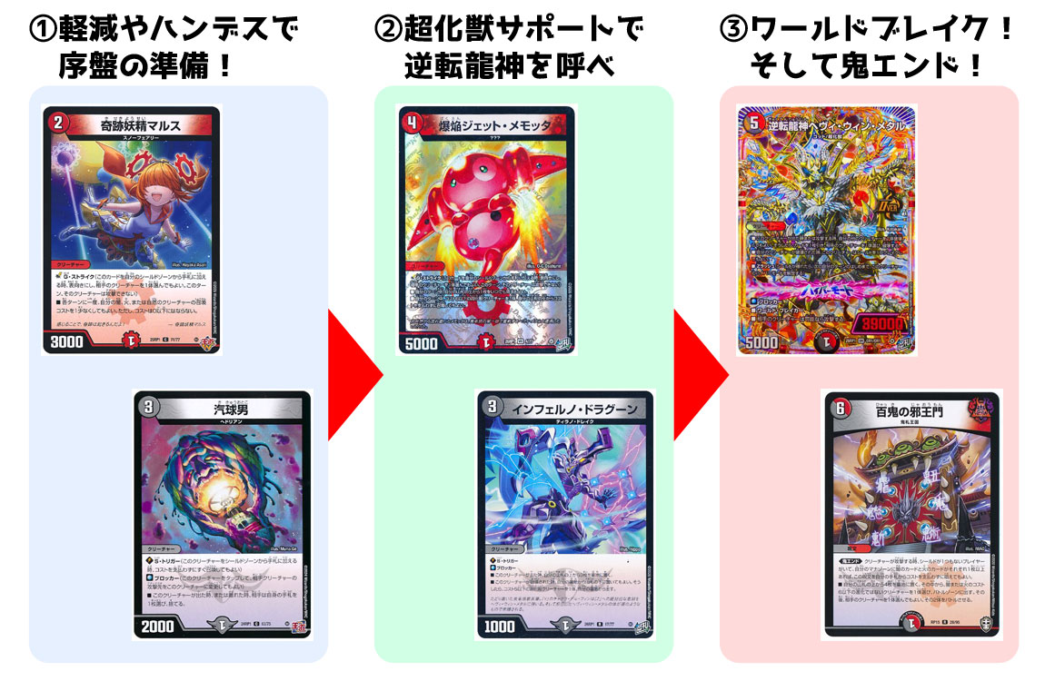また、ワールド・ブレイクで攻め込む=シールド0の状況が生まれるため、《 百鬼の邪王門 》の鬼エンドが満たしやすい。