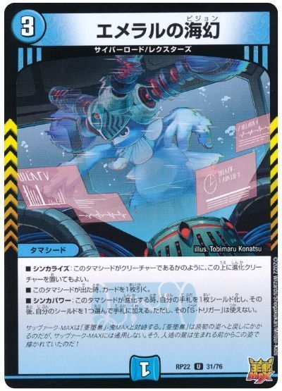 ■シンカパワー:このタマシードが進化する時、自分の手札を1枚シールド化し、その後、自分のシールドを1つ選んで手札に加える。ただし、その「S・トリガー」は使えない。