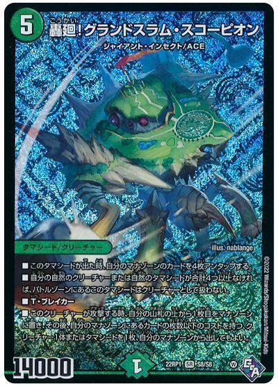 《 轟廻!グランドスラム・スコーピオン 》。軽減下だと自分のコストよりアンタップするマナの方が大きくなるので、妙なコンボやループが狙えそうです。