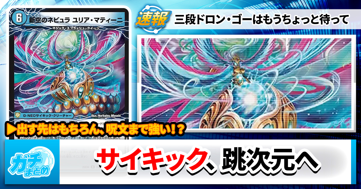 跳次元召喚は、出てくる先も当然強い……ということで、お次は《時空のネビュラ マティーニ/新空のネビュラ ユリア・マティーニ》!「覚醒しないサイキック」、堂々の登場です。