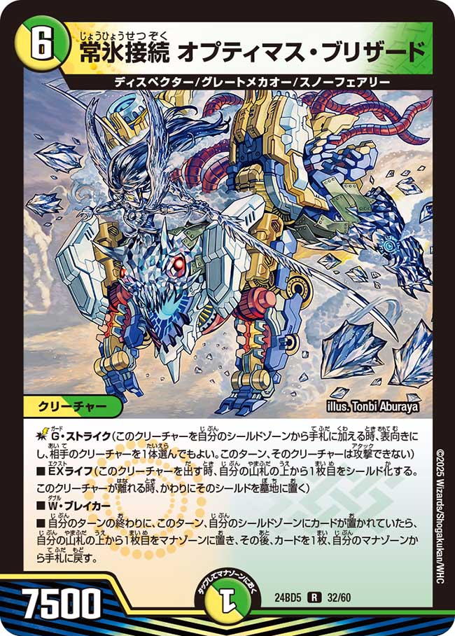 ■自分のスノーフェアリーが5つ以上あれば、自分のクリーチャーすべてのパワーを+6000し、「パワード・ブレイカー」を与える。(「パワード・ブレイカー」を持つクリーチャーは、そのパワー6000ごとにシールドをさらに1つブレイクする)