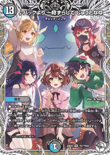 ■自分の山札の上から5枚を見る。その中から、コスト9以下の光のクリーチャー、水のクリーチャー、闇のクリーチャー、火のクリーチャー、自然のクリーチャーをそれぞれ1体ずつ選び、出してもよい。その後、残りを手札に加える。次の自分のターンのはじめまで、こうして出したクリーチャーに「スピードアタッカー」「スレイヤー」「ブロッカー」を与える。