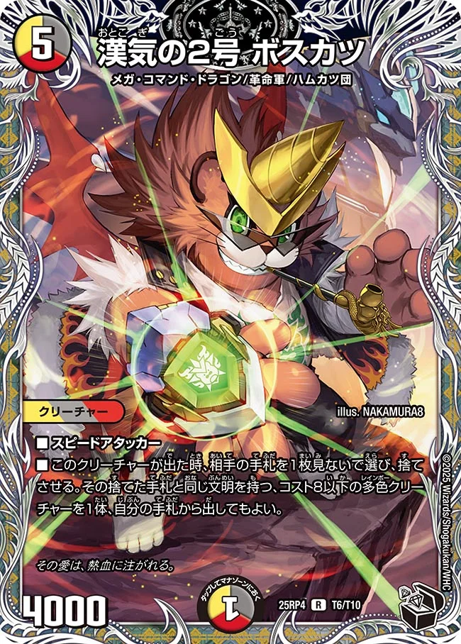 種族 メガ・コマンド・ドラゴン/革命軍/ハムカツ団 / 文明 光/火/自然 / パワー13000 / コスト8