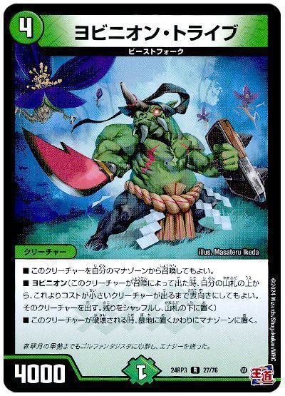 ■ヨビニオン(このクリーチャーが召喚によって出た時、自分の山札の上から、これよりコストが小さいクリーチャーが出るまで表向きにしてもよい。そのクリーチャーを出す。残りをシャッフルし、山札の下に置く)