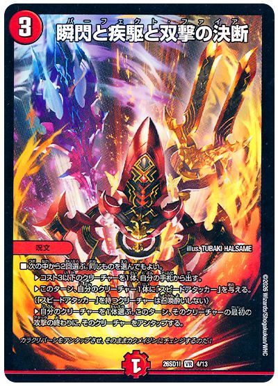 特に《 芸魔王将 カクメイジン 》からさらに《 芸魔王将 カクメイジン 》に革命チェンジしたうえで《♪音速で 本番中に チューニング》《 瞬閃と疾駆と双撃の決断 》を使うと、「(チェンジ先のクリーチャーの)最初の攻撃」になるのでまたアンタップして攻撃可能……というのは忘れてはいけません。