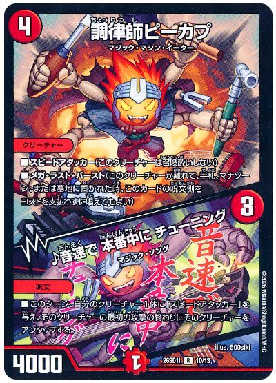 基本的には《♪音速で 本番中に チューニング》《 瞬閃と疾駆と双撃の決断 》を自身に使ってアンタップし、再攻撃時に《 芸魔王将 カクメイジン 》に革命チェンジするのが理想です。