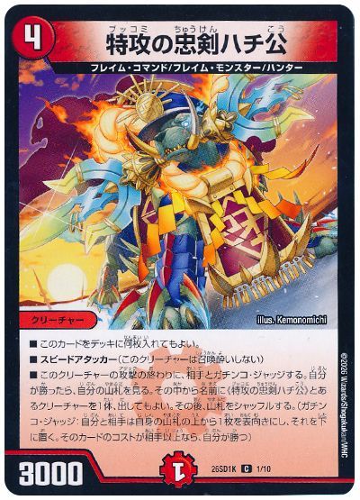■このクリーチャーの攻撃の終わりに、相手とガチンコ・ジャッジする。自分が勝ったら、自分の山札を見る。その中から、《特攻の忠剣ハチ公》を1体、バトルゾーンに出してもよい。その後、山札をシャッフルする。