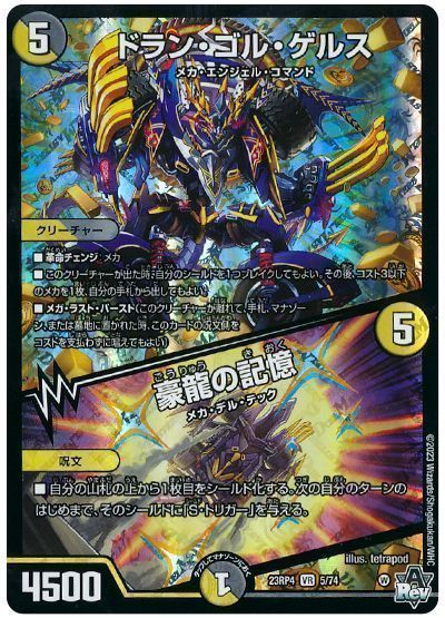 攻撃する時に《 ドラン・ゴル・ゲルス 》に革命チェンジを宣言→攻撃時効果でシールド追加&メカ・メクレイド→革命チェンジで手札に戻す→《 ドラン・ゴル・ゲルス 》の効果で出し直し、タップ状態の隙を消しつつ、一度バトルゾーンを離れたことで「ターンに一度」効果を復活させる……という動きは、決まれば一気に有利になります。