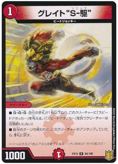 ■G・G・G:自分の手札が1枚以下なら、このクリーチャーに「スピードアタッカー」を与える。(「スピードアタッカー」を持つクリーチャーは召喚酔いしない)