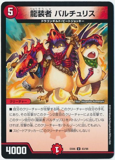 ■自分のクリーチャーが攻撃する時、このクリーチャーが自分の手札にあり、その攻撃がこのターン2度目のクリーチャーによる攻撃で、このターン自分の《龍装者 バルチュリス》をバトルゾーンに出していなければ、攻撃の後、このクリーチャーをバトルゾーンに出してもよい。■スピードアタッカー(このクリーチャーは召喚酔いしない)